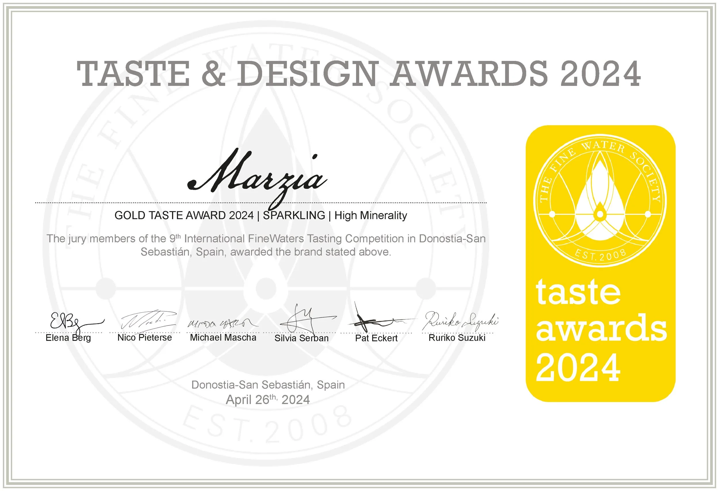 At this year's edition of the Taste Awards, organized by the Fine Water Society, a global authority dedicated to celebrating and educating about the world’s best mineral waters, Marzia Sparkling proudly brought home the Gold Medal in its category, while Marzia Still was awarded the Silver Medal.
